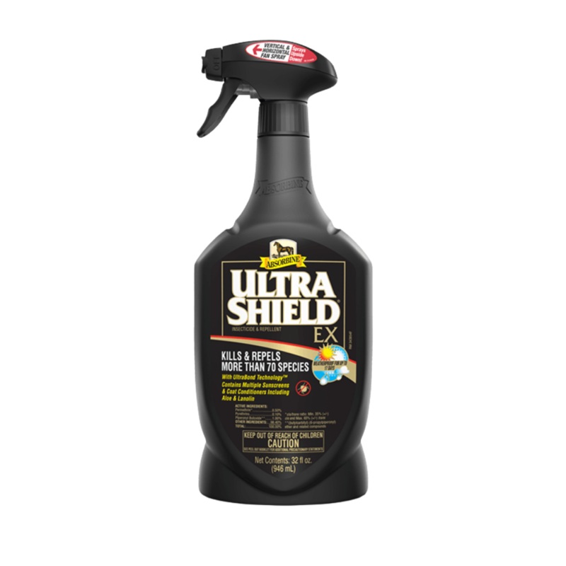 As the most advanced insecticide and repellent Absorbine offers, UltraShield EX fly spray for horses delivers proven fly control that horse owners like you have counted on for decades.Kills and repels biting and nuisance flies, mosquitoes, ticks, and gnatsKills and repels more than 70 speciesContains multiple sunscreens and coat conditioners, including aloe and lanolinFeatures a weatherproof formulaDesigned for the most challenging conditionsCan be used on horses, dogs, and as a premise sprayUltraShield EX Insecticide & Repellent can also function as a premise sprayan important part of your overall fly control strategy. Premise sprays are commonly used to kill biting and nuisance flies, as well as crawling species such as deer ticks and carpenter ants on surfaces inside your barn.