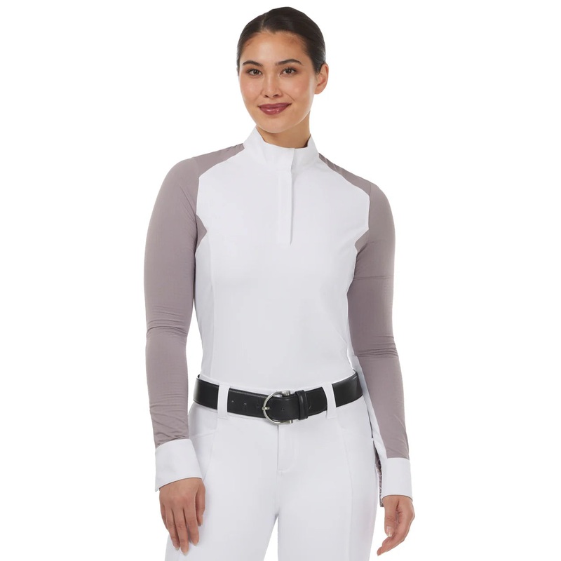 This Affinity Pro Long Sleeve Show Shirt cools and breathes effortlessly thanks to the strategically positioned contrasting mesh sleeves and back panel. Light and stretchy, micro-herringbone fabric covers beautifully and fights odors for body-mind confidence that gives you a competitive edge. Feminine tailoring for a smooth fit under your show coat. Exclusive equestrian prints inside collar, snap placket, and cuffs add style points as you toast your wins later.