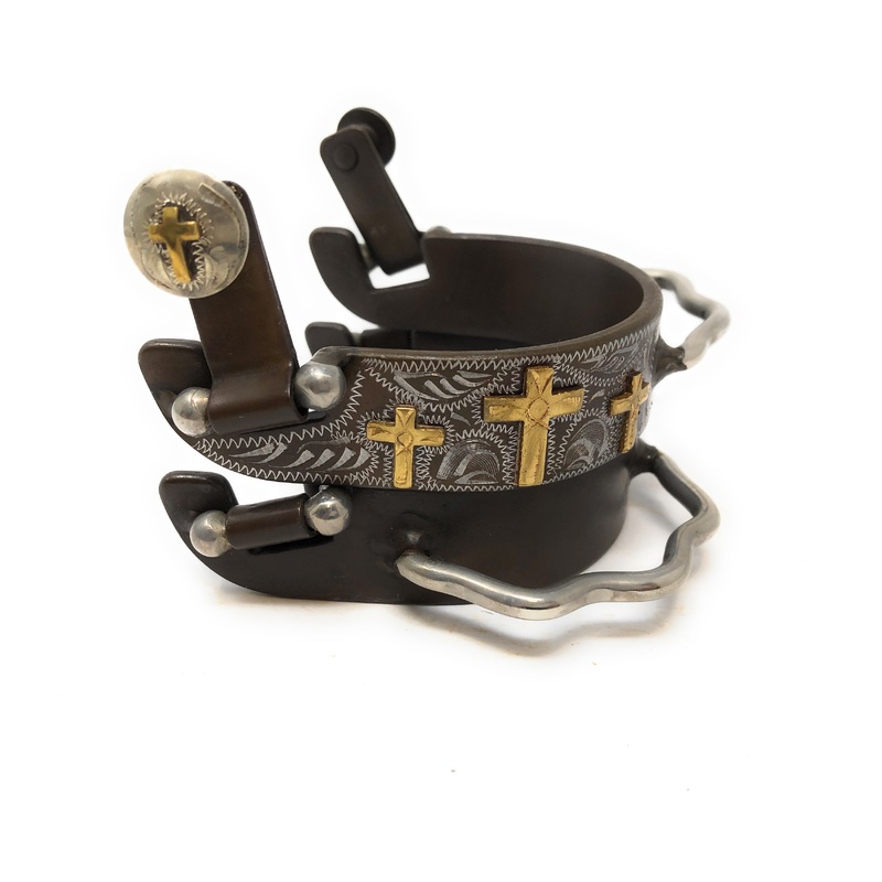 The AJ Tack Ladies Antique Brown Three Cross Bumper Spurs are crafted from brown steel and feature a humane bumper design, ensuring a gentle experience for your horse. These show spurs are beautifully adorned with three gold crosses and etched silver designs, with a small gold cross on the buttons. Easy to put on and remove, these spurs are perfect for any lady rider.