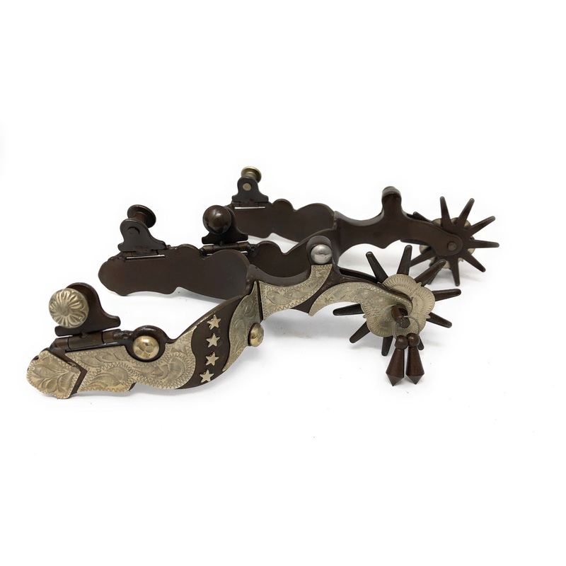The AJ Tack Men’s Antique Brown Stars Western Spurs combine rugged functionality with understated elegance. These antique brown show spurs feature a hand-engraved silver overlay adorned with four small silver stars, perfect for adding a refined touch to your western gear.