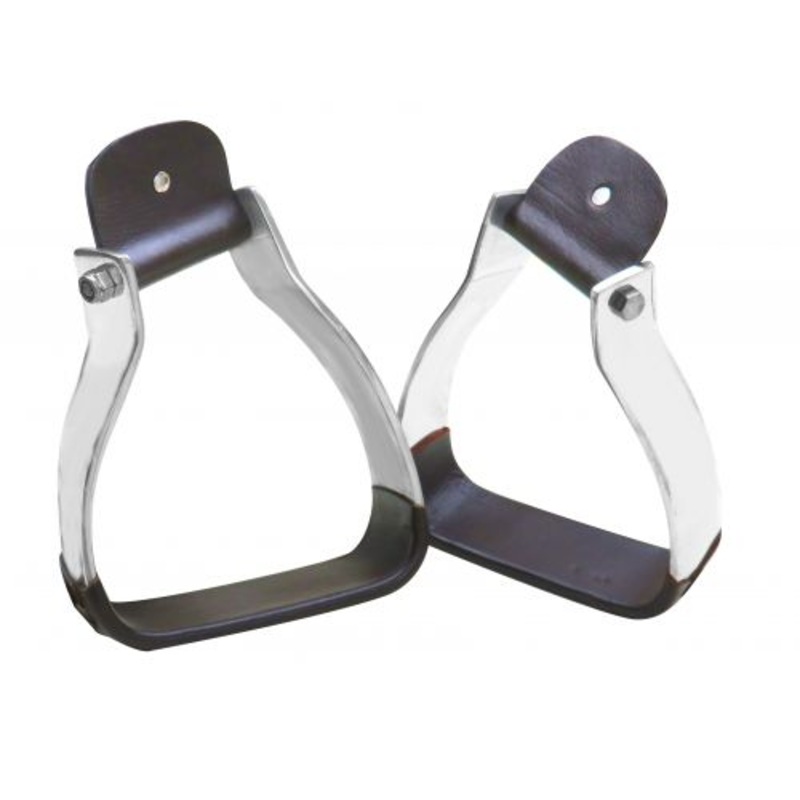 Showman Angled aluminum angled stirrups with twisted neck. Light weight aluminum with a dark chocolate color leather tread. Angled with a twisted neck for a more comfortable ride. 6″ boot width, 3″ neck, 2″ tread.