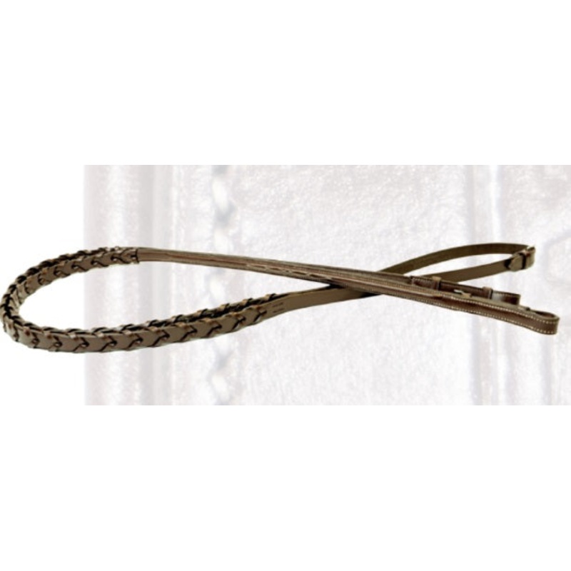 Laced reins 5/8 with square raised,fancy stitched fronts Hook studs Stainless steel buckle Cream stitching. Color: brown High-quality buffalo leather Sizes: Pony (0) - Cob (size 1) - Full (size 2) - X full (size 3)