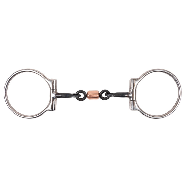 The Antique Offset Dee Ring Bit W/ Copper Roller features a double jointed mouthpiece with an antique finish. The double jointed mouthpiece features a copper roller and provides tongue relief. Copper encourages salivation and helps to soften the mouth. The dee ring cheeks will not slide through the horse’s mouth. The offset dee applies pressure to the lip on the opposite side of the horse’s mouth when the rein is pulled making it a great choice for horses who struggle with steering or connection through turns. Direct action, no leverage.