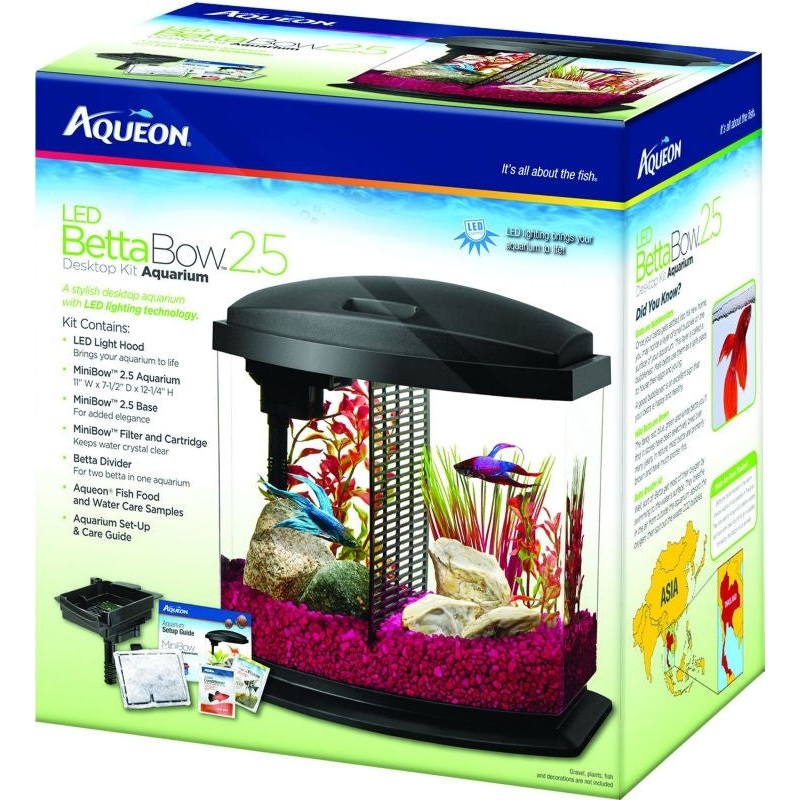11 w x 7.5 d x 12.25 h, A stylish desktop aquarium with led lighting technology., Led light hood brings the aquarium to life, minibow base for added elegance, filter and cartridge keeps water crystal clear., Betta divider for two betta in one aquarium., Includes aqueon fish food and water care samples and aquarium set-up and care guide.