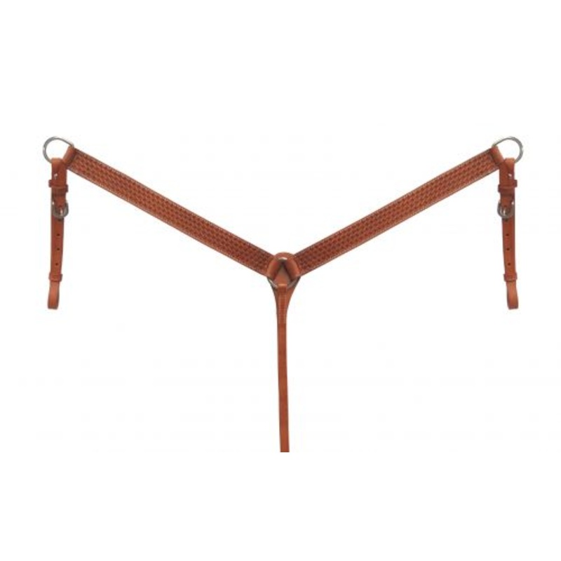 Showman Argentina cow leather breast collar with basket tooled design. This breast collar features Argentina cow leather with stainless steel hardware and a basket tooled design.*Please note each computer monitor will display colors differently.Proposition