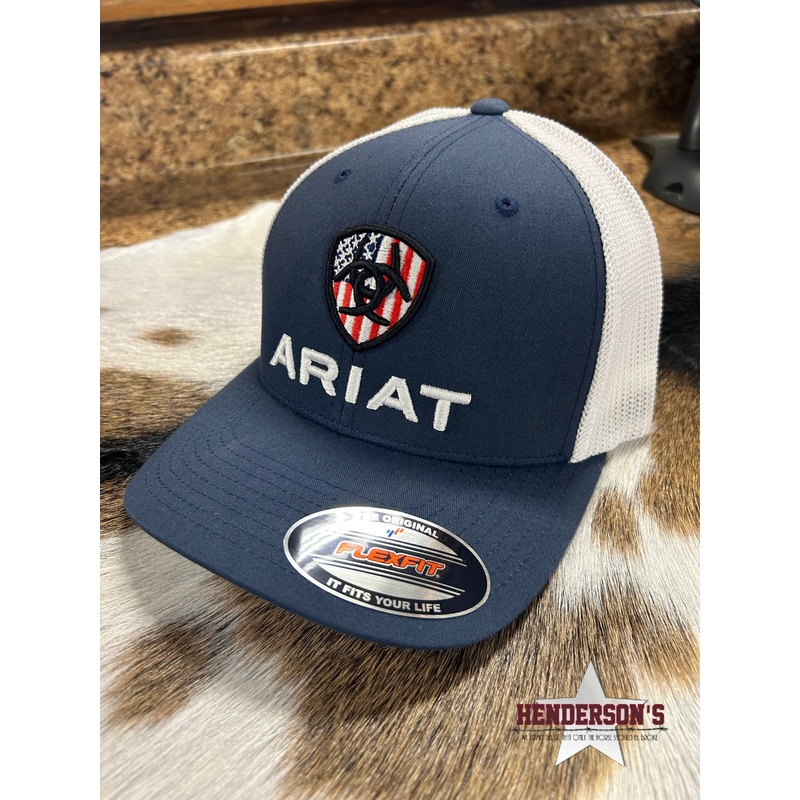 Ariat cap by M&F Western Products. Navy fabric with stitching on the front panel and bill. USA flag shield logo. White mesh back and snap back closure for that perfect fit.