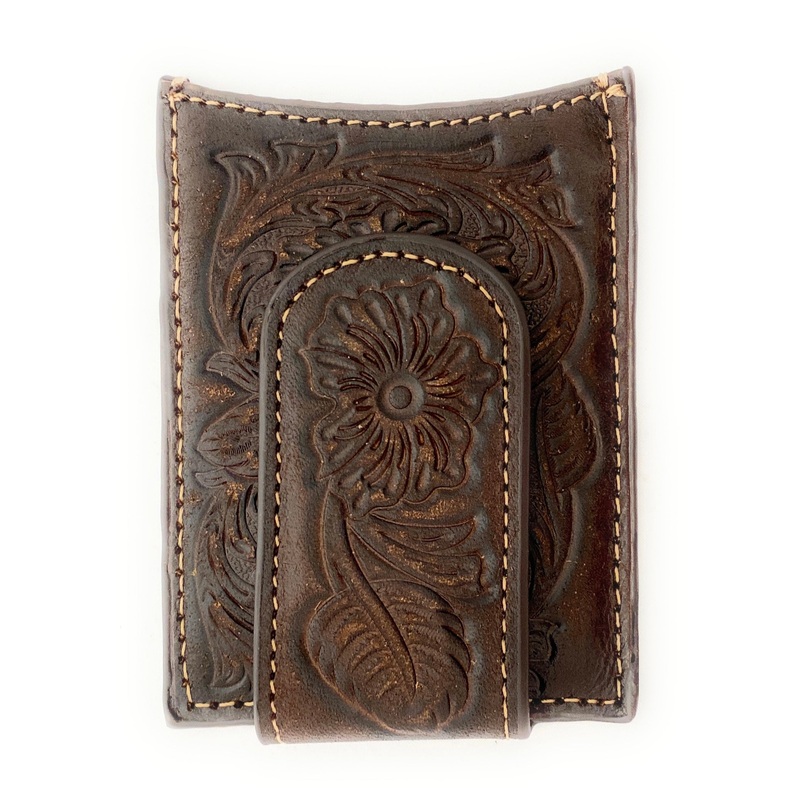 This leather AriatTM money clip wallet by M&F Western Products features a beautiful western floral embossed pattern. Inside consists of credit card slots, money slots, and a place for your ID.