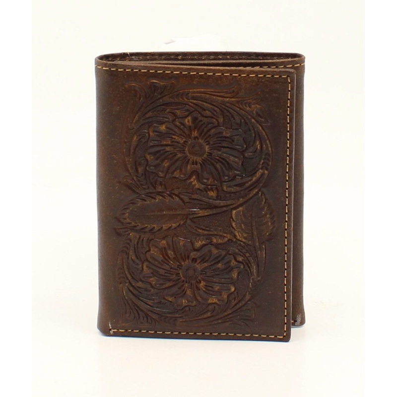 Ariat mens all over floral embossed trifold wallet. Wallet has multi credit card slots, picture slots and clear drivers license slot.Color:Brown
