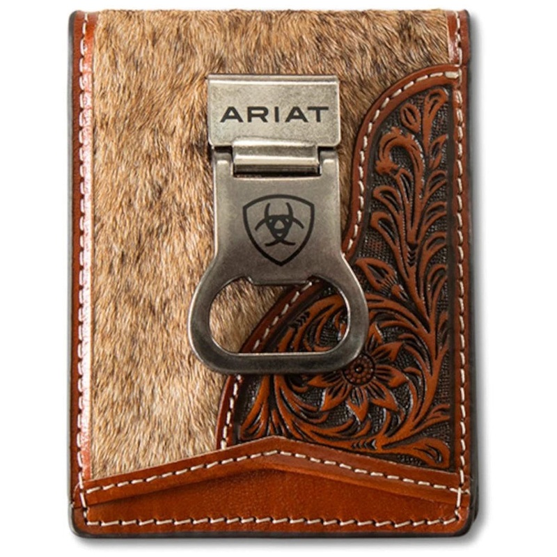 This Ariat money clip wallet by M&F Western Products is genuine leather. Light brown calf hair body with a floral embossed overlay at the bottom. Laser etched Ariat shield in the center. Bottle opener money clip on outside.