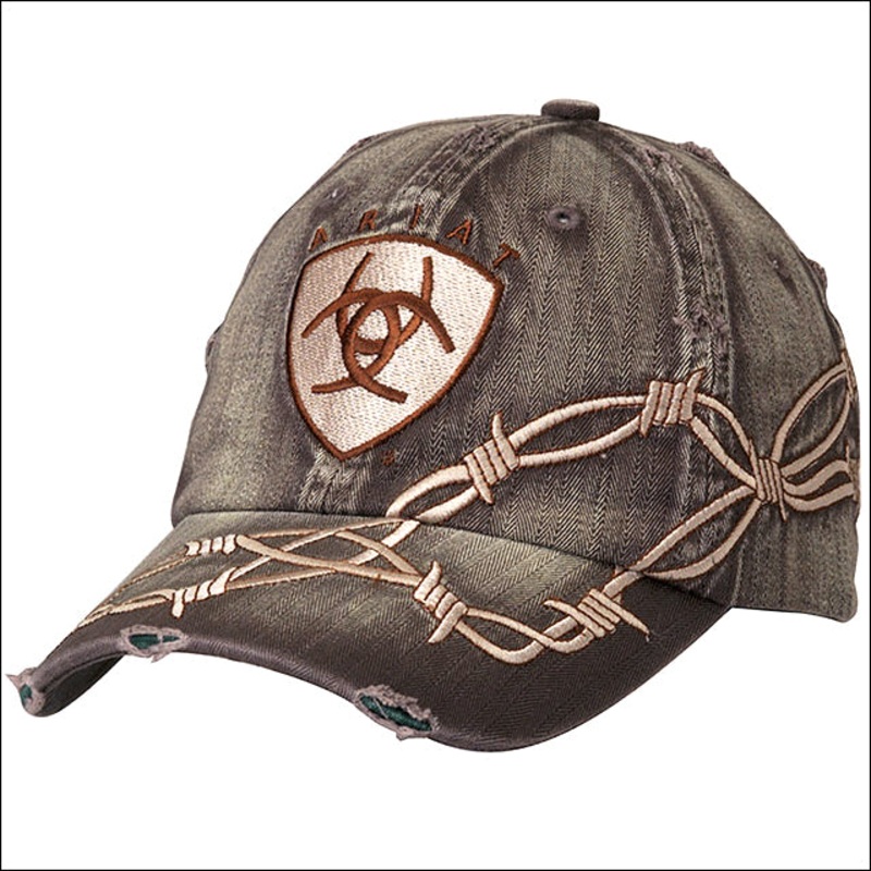 Product ID: MF-1509802 — Mens Ariat Western Hat: Enjoying the outdoors or just another day at work! This men’s Ariat cap will get you through the day. Featuring a tan and brown Ariat logo on front, a brown logo on the back, brown and tan barbwire embroidered design, frayed detail and Hook and Loop fastner back closure.