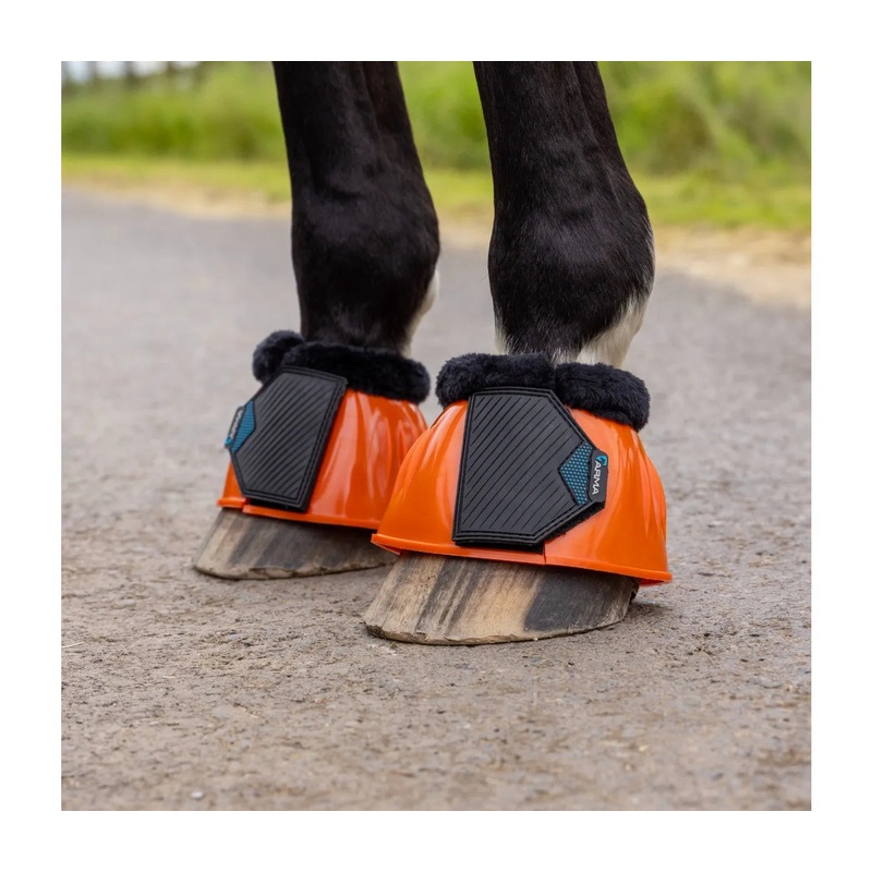 Durable over reach boots in bright glossy colors. Fur trimmed tops protect delicate pasterns, the flexible material protects the heel bulb during schooling, exercise or turnout. Easy grip double-sided touch close straps secure the boot with reassurance. Attractive wide rubber straps are finished with the ARMA logo.