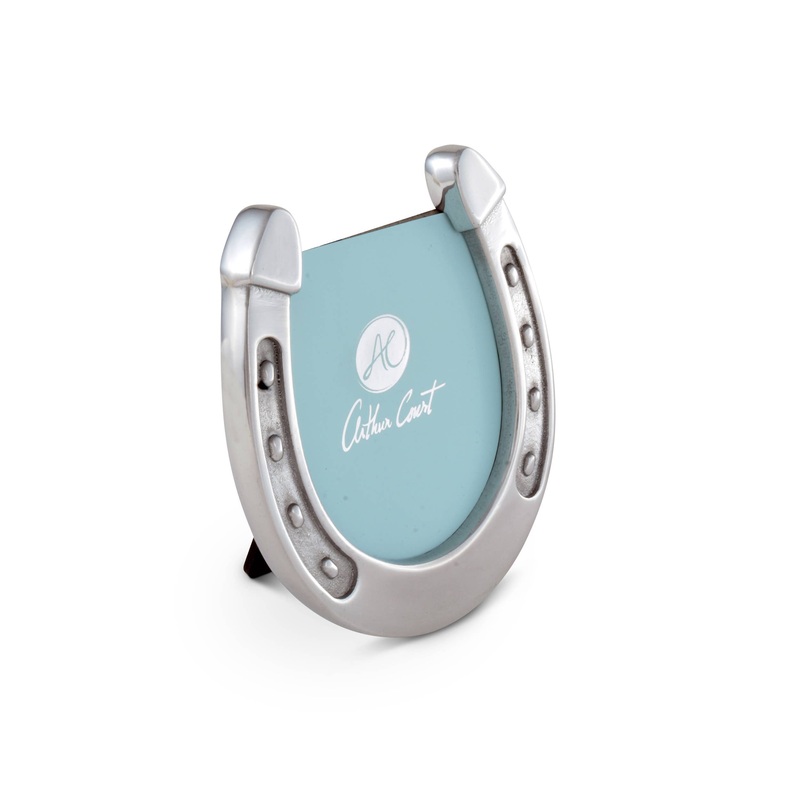 Display your cherished memories in western style with the Arthur Court Horseshoe Photo Frame. This unique frame, designed to hold a 3" x 4" photo, features a distinctive horseshoe shape that brings a touch of equestrian charm to any space. Handcrafted from
