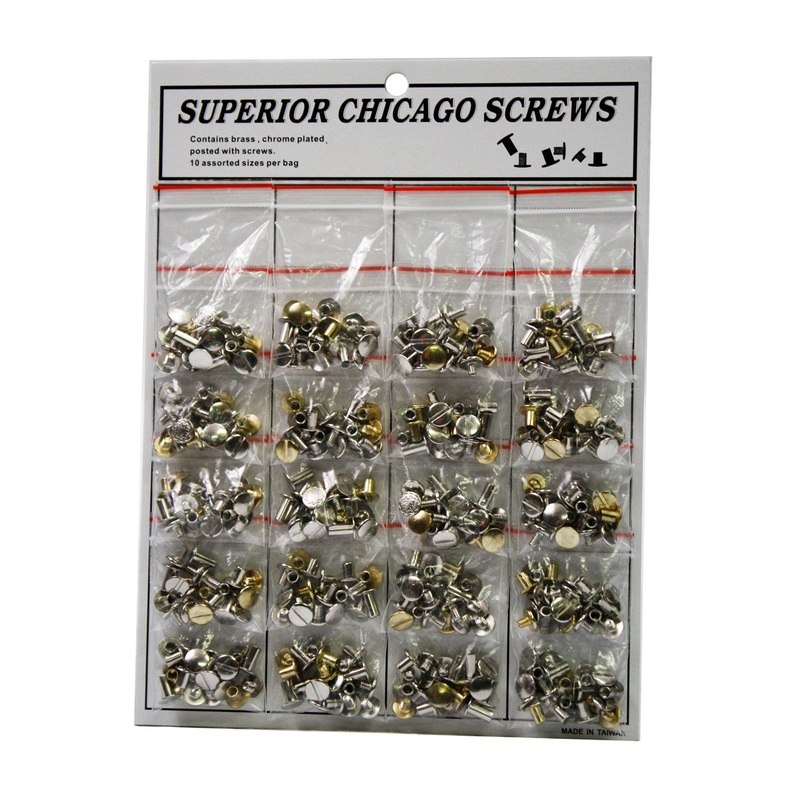 The Assorted Chicago Screw Pack is a must-have collection of high-quality hardware for any western rider or leatherwork enthusiast. This versatile assortment features a wide variety of Chicago screws in brass and chrome-plated finishes, offering both plain and floral head designs to suit various styles and applications. Whether you’re repairing tack, attaching a concho, or working on other leather projects, these durable screws provide a reliable and stylish solution.Each card contains 200 Chicago screws, neatly packaged in 20 bags with 10 assorted sizes per bag. This ensures youll always have the right size on hand for any task, making this assortment an essential addition to your toolkit. Durable, easy to use, and designed for performance, these screws are ideal for small leather repairs, customizations, and upgrades.Wide Variety of Options: Includes a mix of brass and chrome-plated Chicago screws for diverse styling needs.Stylish Designs: Features both plain and floral heads, perfect for adding a decorative touch or maintaining a classic look.Ample Supply: Contains 200 screws per card, with 10 assorted sizes per bag and 20 bags in total.Versatile Application: Ideal for leather repairs, attaching conchos, and other tack customizations.Durable and Reliable: Made with superior materials to ensure strength and longevity, even in demanding conditions.Convenient Packaging: Organized in individual bags for easy storage and quick access.Essential Hardware: A go-to solution for western riders, leatherworkers, and anyone who values functionality and craftsmanship.var TabbedPanels1=new Spry.Widget.TabbedPanels(TabbedPanels1);