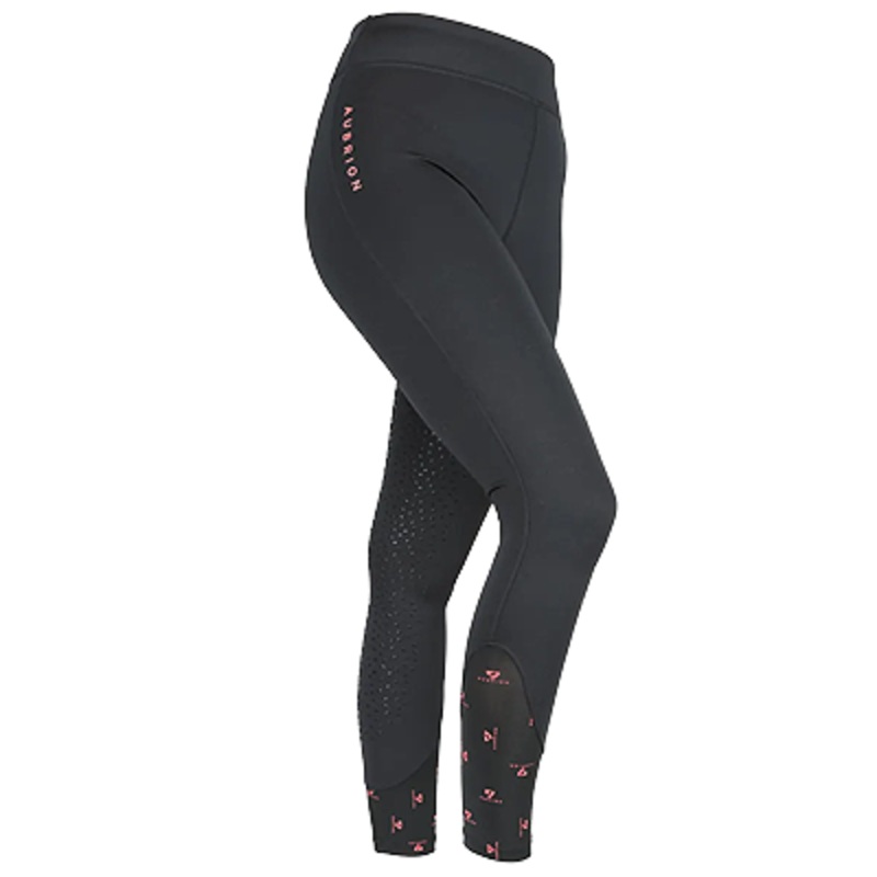 In colder weather, these stretch thermal riding tights are fleecy on the inside to offer extra warmth without compromising on freedom of movement. Style detail: silicone knee patches, sleek ankle cuff, smooth outer, reflective detail, Aubrion prints. 95% polyester, 5% spandex. Ladies.