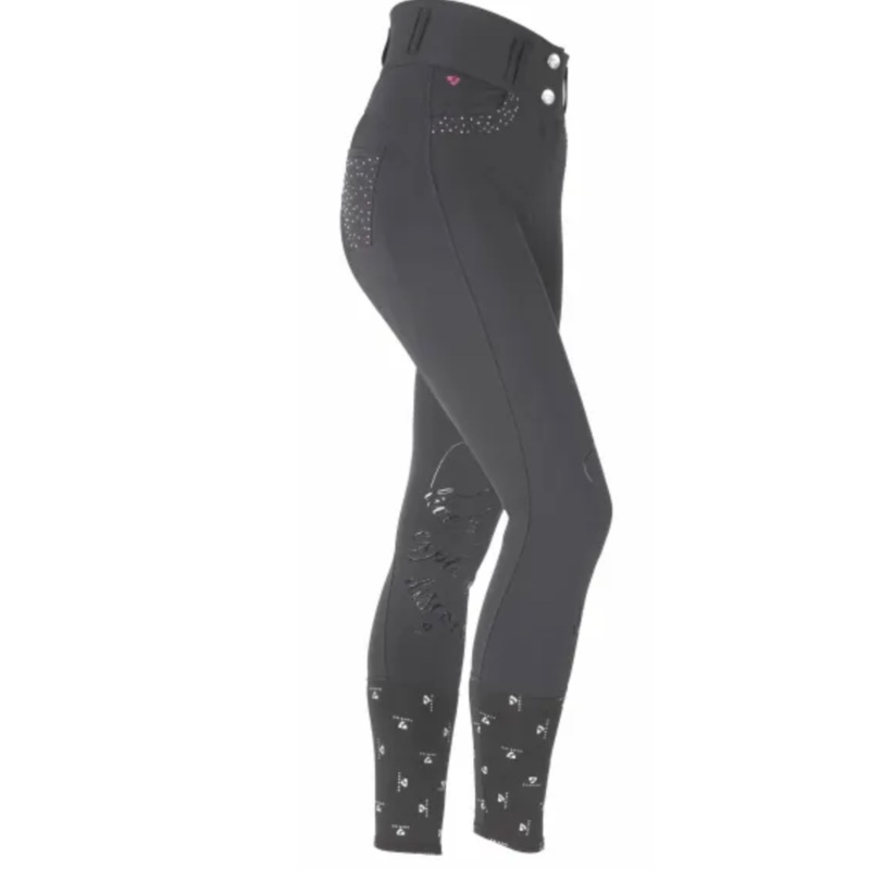 Add a little sparkle to your riding with these diamante studded breeches. Style detail: high-waisted, silicone knee grips, belt loops, zip fly with double glitter enamel buttons, jean style pockets with diamante and silver trim, sleek dry cuffs, Aubrion prints.