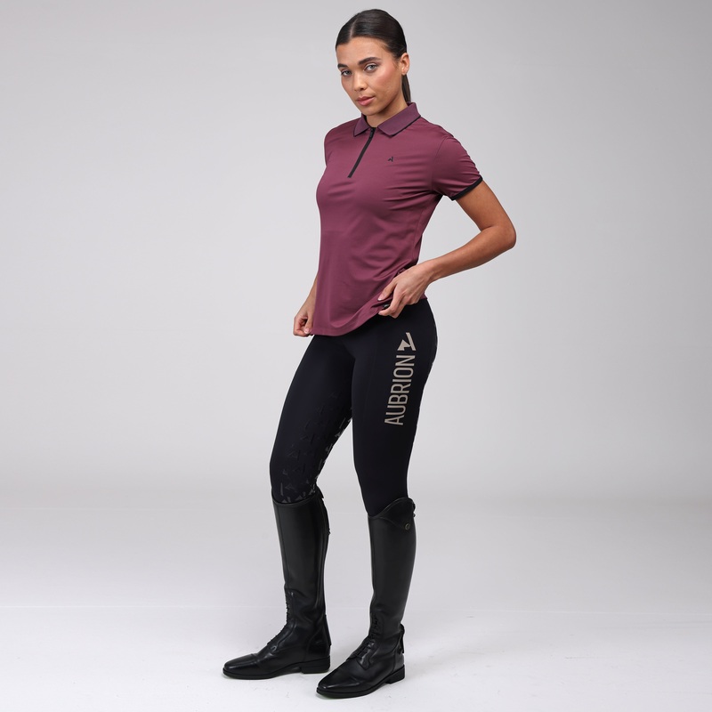 When the heat is on and youre busy with summer riding activities, the Tech Polo is your perfect activewear go-to. The airy knit is constructed from wicking, quick-dry polyester fibres which remains comfortable against the skin, cool drying breezes can flow through and help move the heat away. Light stretch for ease of movement, the short sleeve version features soft signature trims to avoid chafing. The zip neck allows extra ventilation, and the polo collar gives a smart look. Key features: airy knit, wicking and quick drying, light stretch, zip, polo collar, split side hems, Aubrion React logo prints.