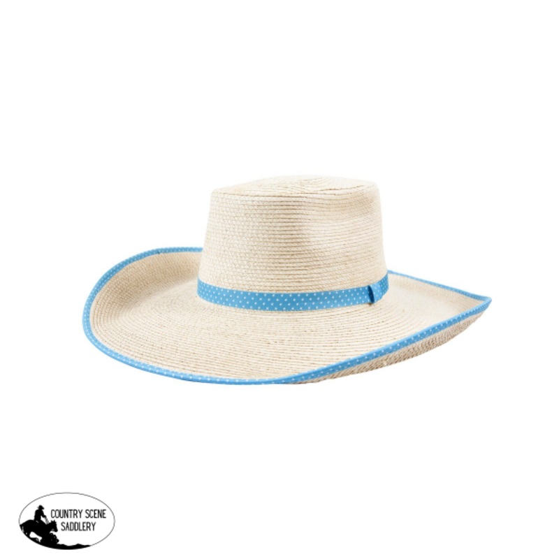 FeaturesColour NaturalSemi-Telescoped CrownGuatemalan standard palm leafBound Edge and Matching Hat Band in aqua polka dotsApproved for ReshapingSize4 Brim / 4 Crown(62739)