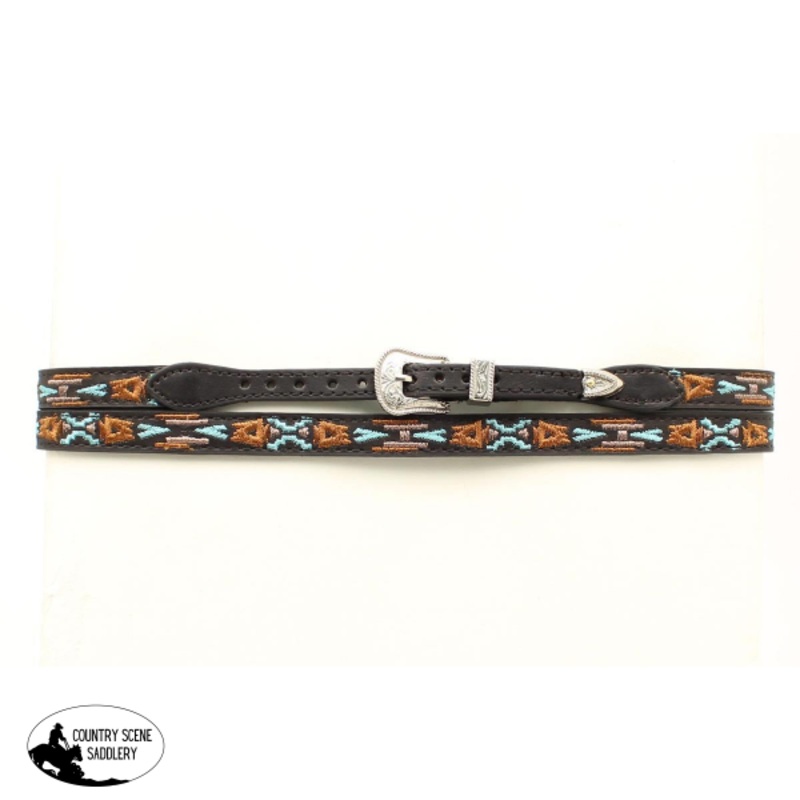 A great western hatband for the fashionable cowboy. This very unique hatband features a fancy embroidered aztec print. This style hatband uses a belt style adjustment with a rounded silver buckle.