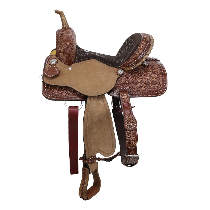 The brown suede seat with classic stitching provides exceptional comfort and a secure feel, ensuring confidence during sharp turns and fast runs. Accented with silver berry conchos and silver studs, this saddle boasts a sophisticated Western flair. Leather stirrups with leather tread offer stability and comfort, while the included leather tie strap and off billet provide all the necessary functionality for competitive or recreational riding.
