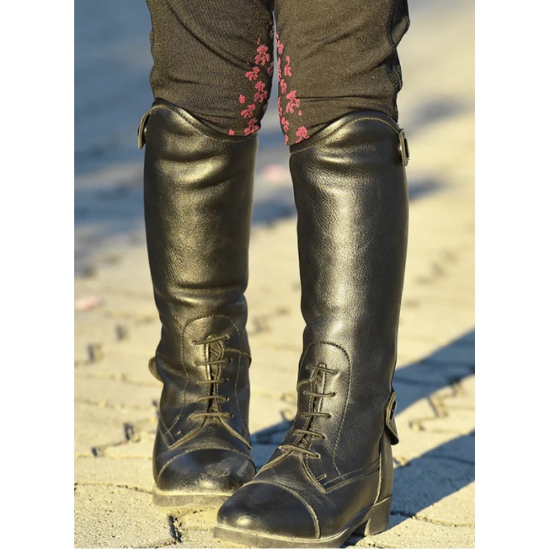A grown up boot for little feet! Kids can wear their Belle & Bow Tall Boots for schooling instead of half chaps or in the appropriate ring for showing! Field boot design with rear zip and snap closure. Soft synthetic leather for out of the box comfort.