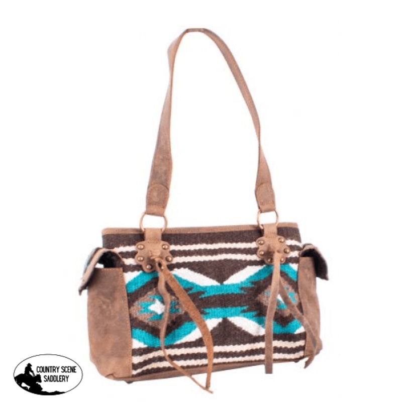Showman Genuine Leather Teal and Brown Saddle Blanket Handbag. This handbag is made of 100% wool saddle blanket with genuine leather. Handbag is lined and includes two zipper pockets, and two open pockets on the inside. Backside is solid genuine leather with a zipper pocket and handbag includes a clasp closure pocket on each side. Handbag has a zipper closure for extra privacy. Measures 14″ at base, 8″ tall, and shoulder straps measures 22 1/2″.