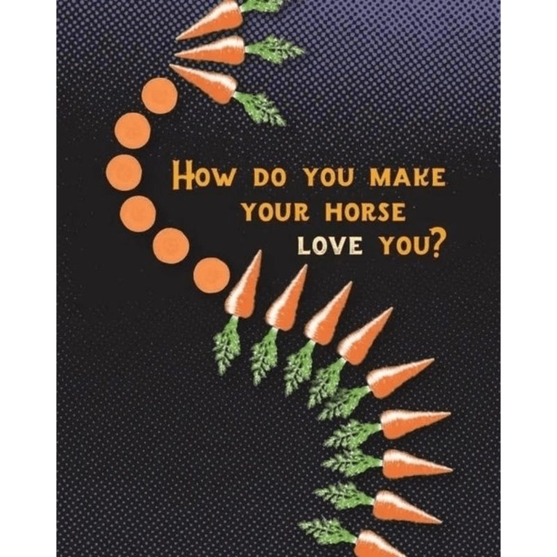 Humorous Birthday card featuring carrots that reads “How Do You Make Your Horse Love You?”