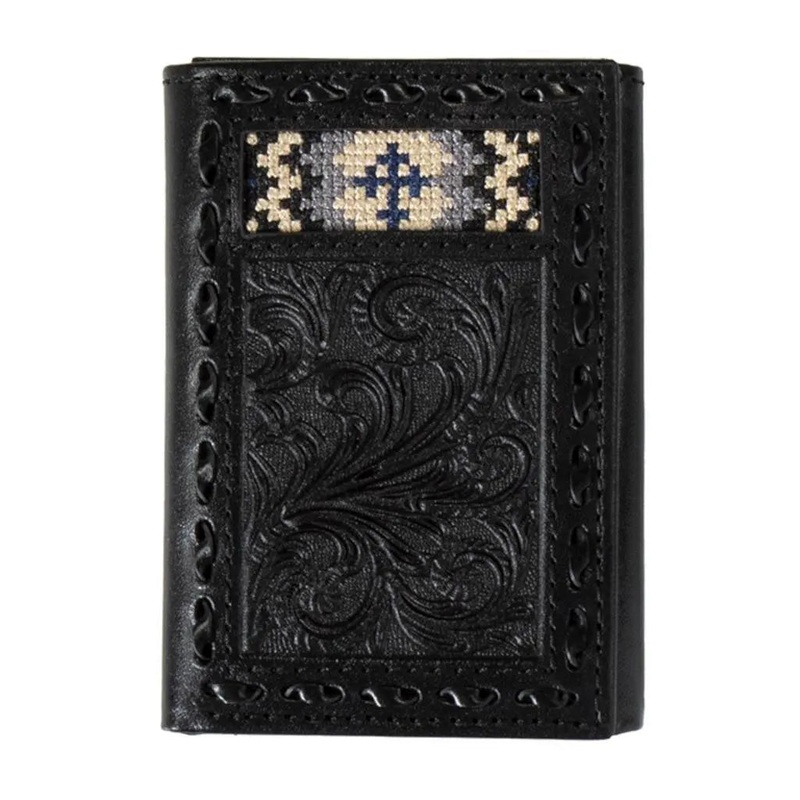 Decorative and stylish mens 3D trifold wallet. It is made of genuine leather with a floral embossed body trimmed with black buck lace stitching on the edge. Blue and black cross embroidery inlay at the top of the wallet.