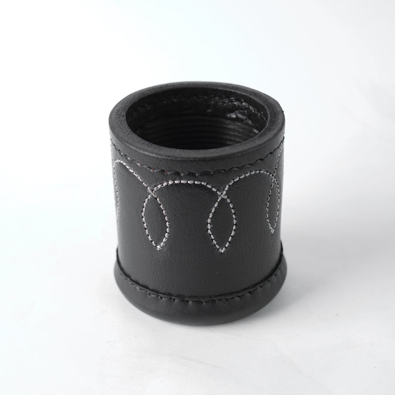 Elevate your Yahtzee game with the Black Leather Yahtzee Dice Cup Set with Ribbed Interior. Crafted with precision, this dice cup features a ribbed interior that ensures your dice roll smoothly and land in perfect position every time. The sleek, black 100% genuine leather exterior not only offers a sophisticated and luxurious feel but also guarantees durability, while the thick hand-sewn thread adds extra strength for long-lasting use.
