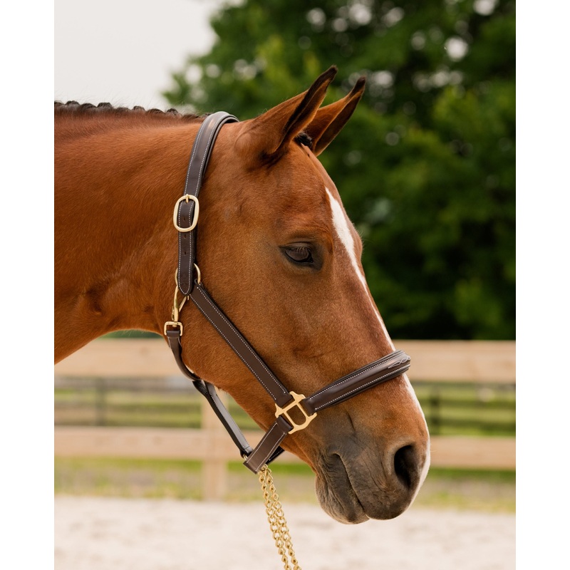 The Fern halter features a round raised noseband and crownpiece, fancy stitching and a fixed noseband. Brown with Brass fittings.