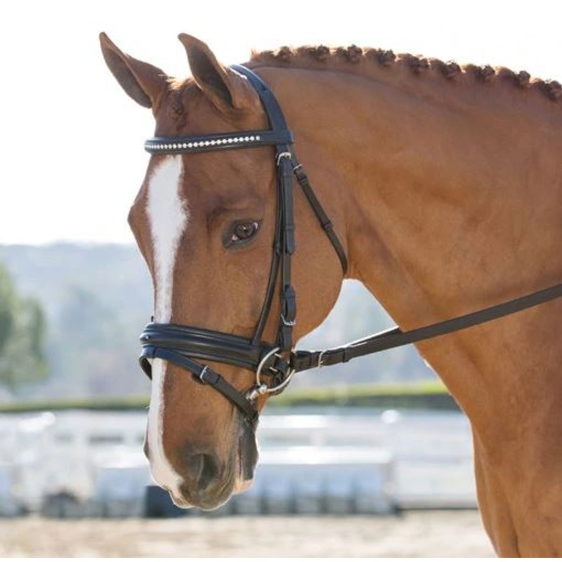 The Black Oak Economy Larkspur Dressage bridle combines exceptional value, with the quality craftsmanship & details KL Select products are known for. The Larkspur features a clear crystal browband that adds sparkle and dresses up the extra wide flash crank noseband. The Larkspur has a 1 5/8 round raised noseband with extra padding for comfort of the horse, a padded 1 crystal browband, 5/8 cheek pieces and a soft padded threaded headstall. Comes complete with Dressage Reins. This bridle is made in a top quality drum-dyed Shalimar leather. All hardware is stainless steel, with buckle ends, and a roller buckle on the noseband.