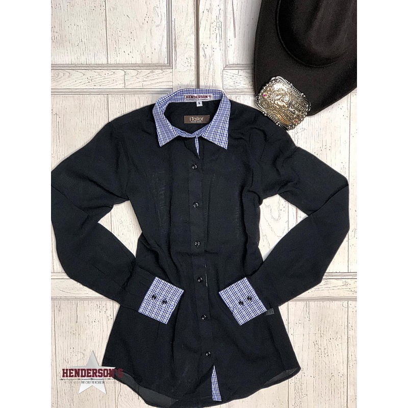 Bold and beautiful….this sheer black with blue & white accented collar and cuffs will catch your eye and create a sleek effect. The cotton shirt is very comfortable and will start her nicely.