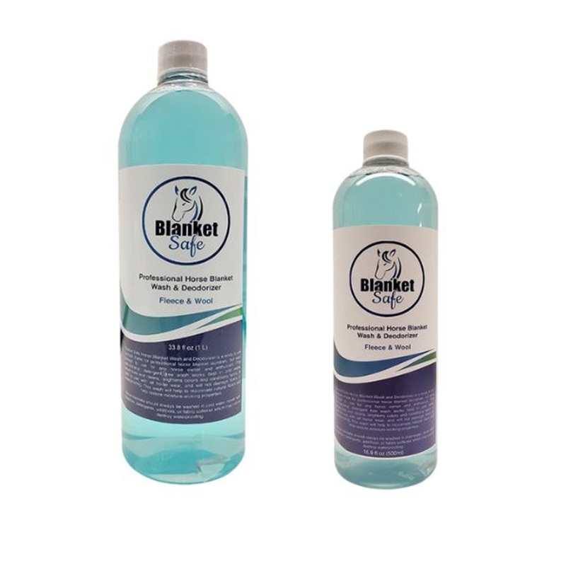 Blanket Safe Wash and Deodorizer is a cold water wash that is detergent-free. It is low-sudsing, residue free, and has built in deodorizers. All made from EPA approved raw materials. These soaps are safe for animals and children once dry. This wash not only gently cleans your blanket of dirt, but the bacteria and grime that cause gross odors!Washes will not ruin or deteriorate your factory applied waterproofing, although it is recommended that you re-proof your blankets after the first two seasons of use. This detergent-free wash has no harmful chemicals making it very safe for sensitive horses and can lower the risk of further skin issues.Washing in cold water lengthens the life of most fabrics and can reduce the degrading of your blankets. This product does not block the breathability of your blankets and sheets.A 16.9 ounce container will wash at least 2 loads depending on soiling and load size. (based on a 65-70 lb. washer)The Blanket Safe Fleece and Wool wash is designed to care for natural fibers and helps restore moisture-wicking capabilities. It will bring your fleece back to life while being gentle enough to use on wool products. For best results of washing wool, with any product, never let any wool products go through the spin or extract cycle of the machine, this can cause matting of hair. Pull out when soaking wet and let dry naturally, never machine dry. Always test in a small area before washing if you are not sure.MADE IN AMERICA