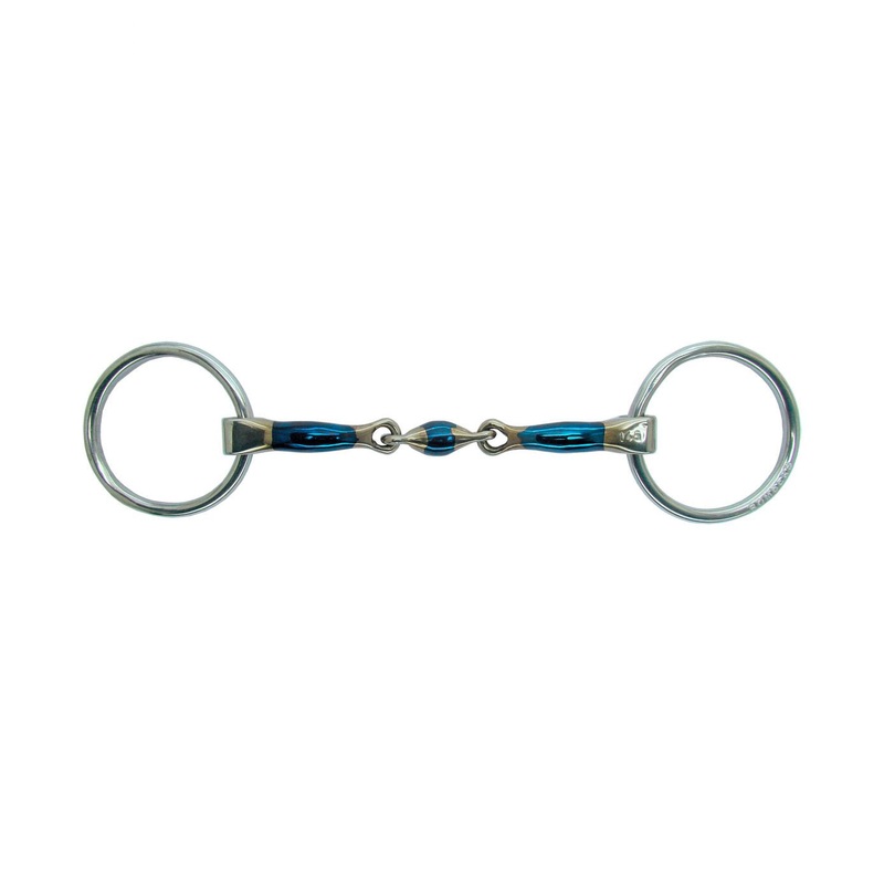 The blue sweet iron mouthpiece oxidises easily, warming up and creating a sweet taste. This encourages the horse to salivate and gently mouth the bit, accepting and softening to the contact.