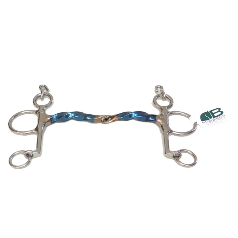 This Bombers Twisted Pelham bit has a slight twist in the blue sweet iron mouthpiece. The twist causes edges that result in pressure points in the horse’s mouth – it increases pressure on the tongue and bars of the mouth, and also acts on the lips. This offers the rider more control than a smooth mouthpiece, and can help to prevent the horse from leaning and also aids in lifting the forehand.