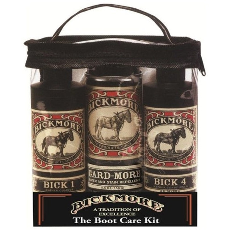 The Boot Care Kit Contains: 8 oz bick 1 cleaner, 8 oz bick 4 conditioner, and 5. 5 oz gard-more water & stain repellent. The kid provides Everything needed for complete leather care. It Will not darken smooth finished leather or leave a residue. Always test prior to use for colorfasteness. Apply bick 1 cleaner to leather. Wipe away dirt. Apply bick 4 conditioner to leather. Rub in well. Use soft cloth to buff to a shine. Apply a light appication of gard-more to leather item. Please NOTE- Contains aerosol items, cannot be shipped outside USA.