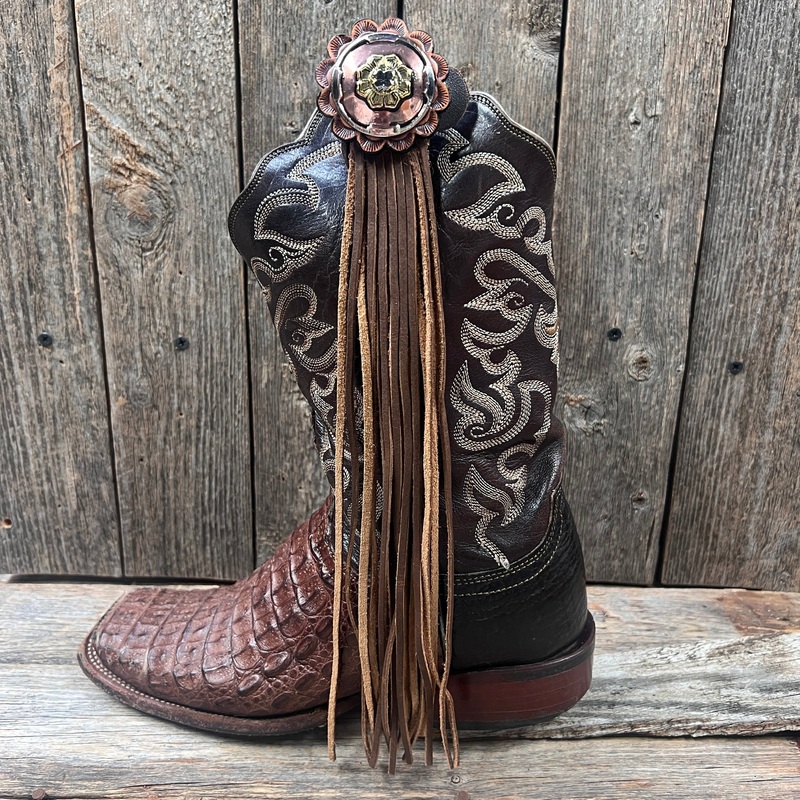 Hand crafted leather rosette, concho, and leather fringe boot accessory. Attaches with leather snap for easy install. (W192L)