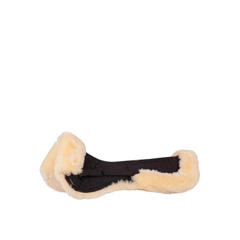 Half pad with a medicinal sheepskin underside with a cutout for the vertebral canal. The half pad comes with four individual inlays, which can be placed in the compartments at the underside of the pad. As a result, the position of the saddle can be adjusted perfectly.