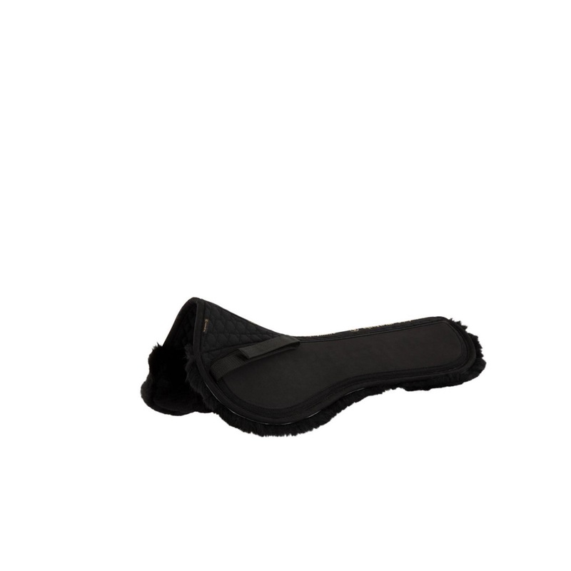 This anatomically shaped half pad in quilted polycotton is lined on the bottom with medically tanned sheepskin, with a channel down the spine to provide additional clearance. On top, the half pad features shock absorbing neoprene gel pads. Thanks to the an