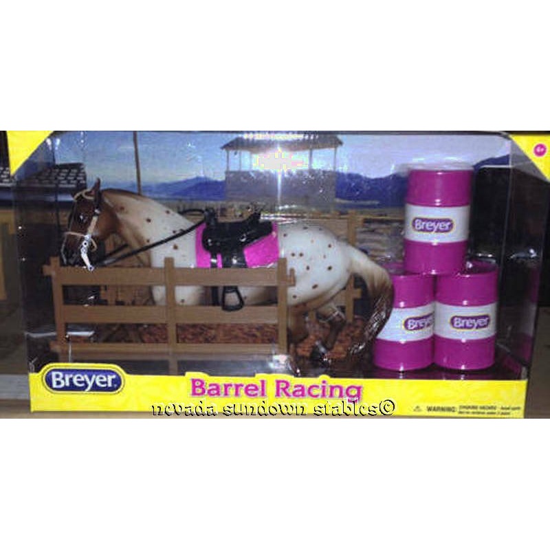 Flashy chestnut Leopard Appaloosa is the perfect barrel racer! Includes: horse, Western saddle pad, Western saddle & bridle, 3 barrels, and 6 sections of fencing.