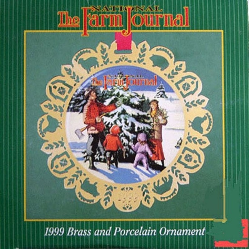The is a limited edition ornament made especially for the Farm Journal in 1999. The winter scene is based on original Farm Journal picture from December 1933. The center is all porcelain and the back and rim of the ornament is brass. This beautiful ornament is great addition to any tree.