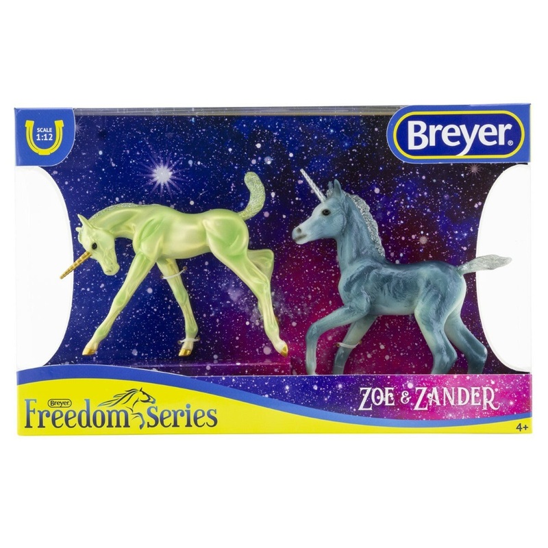 In a hidden glade, two unicorn foals are playing hide and seek. Young colt Zander has a talent for blending in with the sun-kissed greenery. His green coat with golden highlights certainly helps! Filly Zoe finds a winning spot amidst the wildflowers, which beautifully camouflage her blue-green coat.