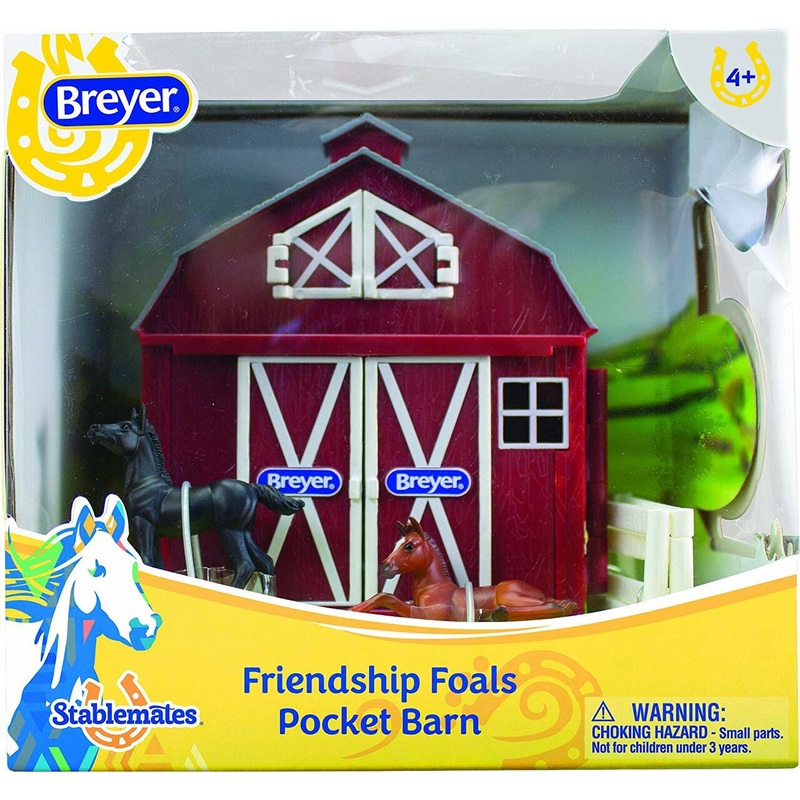 Bring along some farm fun wherever you go! The barn has working doors and closes up to hold everything. The set includes barn, fencing, a black foal and a chestnut foal.Ages 4+