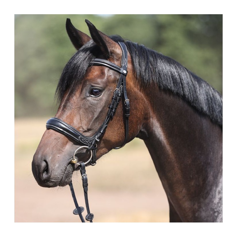 Kavalkade Bridle Ivy Plus -The “Ivy Plus” KavalSH4 snaffle has an English-combined noseband, with the locking strap integrated into the side of the noseband. This relieves the pressure on the bridge of the nose itself and the horse has more breathing room than with a conventional noseband. The great thing is that the locking strap can also be removed. In addition, the snaffle is made of soft quality leather and is padded at the neck and nose. The neckpiece itself is anatomically shaped and wide. The contrasting stitching and decorative stitching on the sides create a chic look. The snaffle is supplied with narrow rubberised reins with bars.