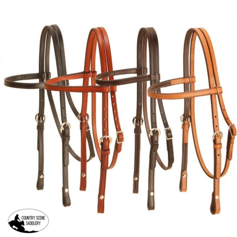 MADE IN USA. This is a double and stitched 5/8" bridle leather bridle with sewn buckle cheeks and Chicago screw bit ends.Matching Reins are also available in same colour and width.Colours L to R: Black, Chestnut, Dark Oil, London(014667)IN STOCK (subject t