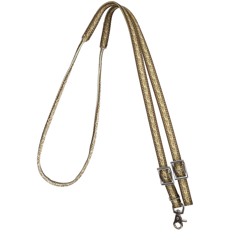 Add a touch of style and comfort to your rides with the Brown Filigree Rolled Nylon Contest Reins. Crafted with premium double-ply nylon, these reins are as durable as they are eye-catching, featuring a fun and colorful brown and tan filigree print that sets them apart from the ordinary.Designed with a rolled center, these roping reins offer a comfortable grip that feels great in your hands, making them ideal for those long rides or quick maneuvers during speed events. The rolled design reduces hand fatigue and gives you better control, whether youre competing or enjoying a leisurely ride.Measuring 7.5 feet in total length, these reins provide ample reach and flexibility for various riding styles. The single scissor snap end ensures easy attachment and quick changes, making them perfect for riders on the go.Constructed from premium double-ply nylon, these reins are made to withstand the demands of everyday riding and intense competition. The durable material is tough enough to handle the rigors of the trail or arena, while the vibrant filigree print adds a fun, stylish touch.Popular among riders who compete in speed events, these reins are designed to give you the edge. Their lightweight construction and comfortable grip make them a favorite for barrel racing, pole bending, and other high-speed disciplines. Elevate your riding experience with the Brown Filigree Rolled Nylon Contest Reinswhere style meets performance. Order yours today and ride with confidence and flair!CLEARANCEThis is a CloseoutDiscontinued item. Sizes, colors and quantities are limited.No refundsNo exchanges on CloseoutDiscontinued items. Products are sold as is.Premium double-ply nylon constructionFun and colorful brown and tan filigree printRolled center for a comfortable gripSingle scissor snap end for easy attachment7.5 feet total length, perfect for various riding stylesIdeal for speed events or everyday ridingvar TabbedPanels1=new Spry.Widget.TabbedPanels(TabbedPanels1);
