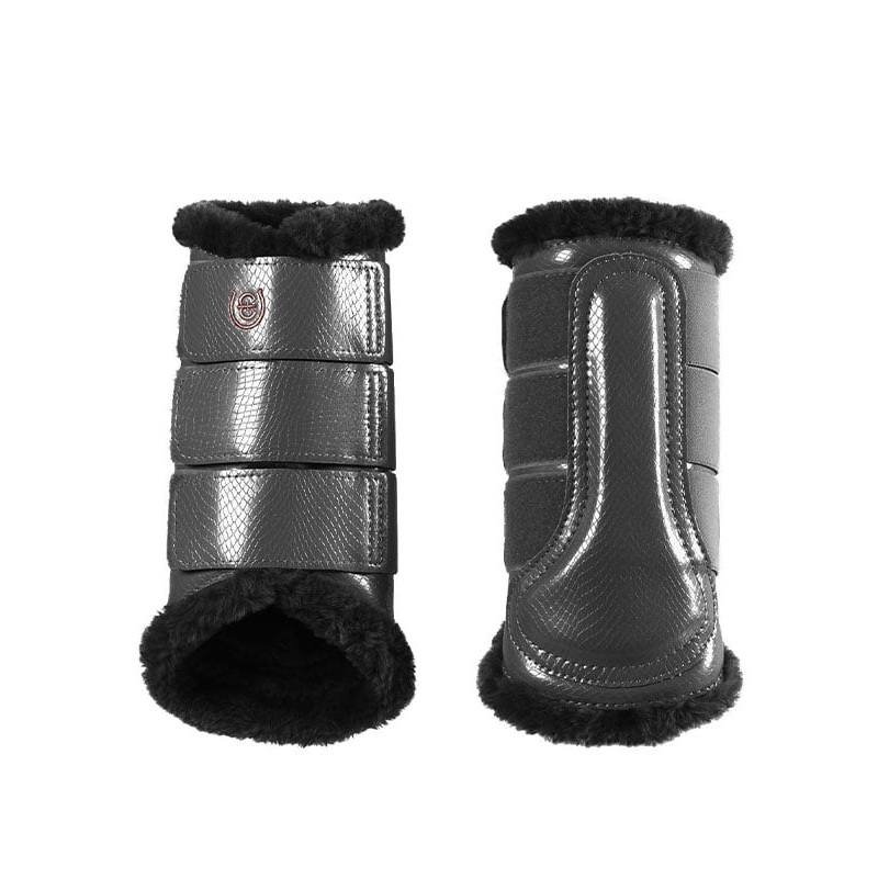 High quality brushing boots with an all-round fit, designed in a beautiful dark grey and paired with black details. Produced in shiny synthetic crocodile imitation PU leather. Super soft teddy fleece faux fur on the inside against the horses leg. Elastic velcro straps with the stylish Equestrian Stockholm logo. Style it with other products from our Dark Sky collection for a complete look. The boots come in pairs of two, they fit both front and hind legs.