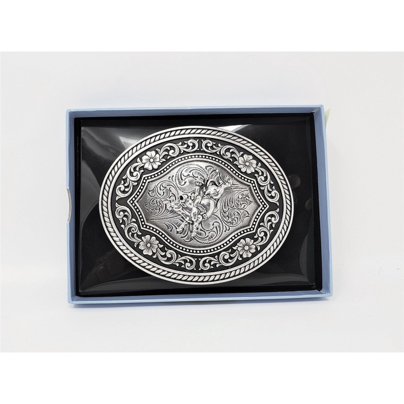 This antique silver belt buckle from Nocona features a bull rider character with floral scroll and rope edge accents. Perfect for any western, rodeo, or cowboy themed outfit. With its classic western style, it is sure to enhance any outfit.