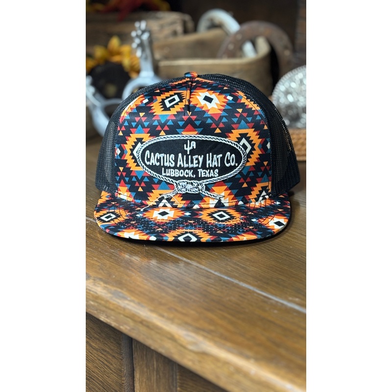 Cactus Alley Sunburst Aztec snapback cap with black mesh featuring our “Cactus Alley Hat Co” patch! From Cactus Alley Hats