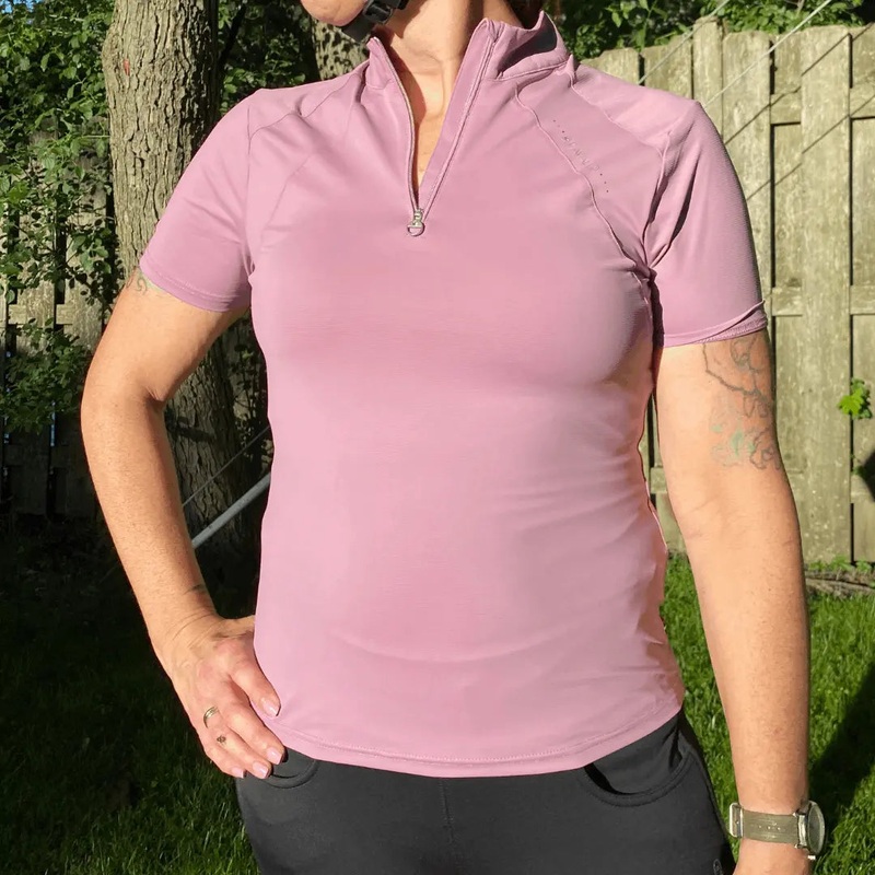 Breathable, sweat wicking, anti-microbialhalf zip training shirt that includes flattering curved front yoke, small stand up collar and short zipper with Cavallo crystal pendant.Silver shimmering Cavallo lettering print with