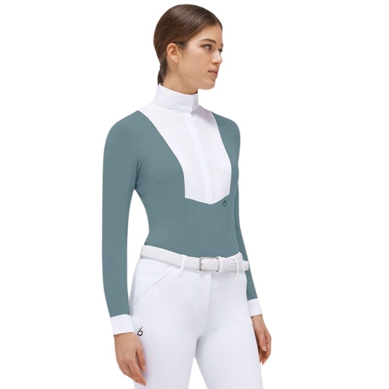 CT Women’s long-sleeved shirt with high collar and hidden buttons. The women’s long-sleeved Hunter shirt features a poplin high collar and a front bib with pleated details and hidden buttons. This competition shirt is made from highly breathable 4-way stretch technical jersey that perfectly fits to the body, following your movements. It features a very small tone on tone logo on the front.
